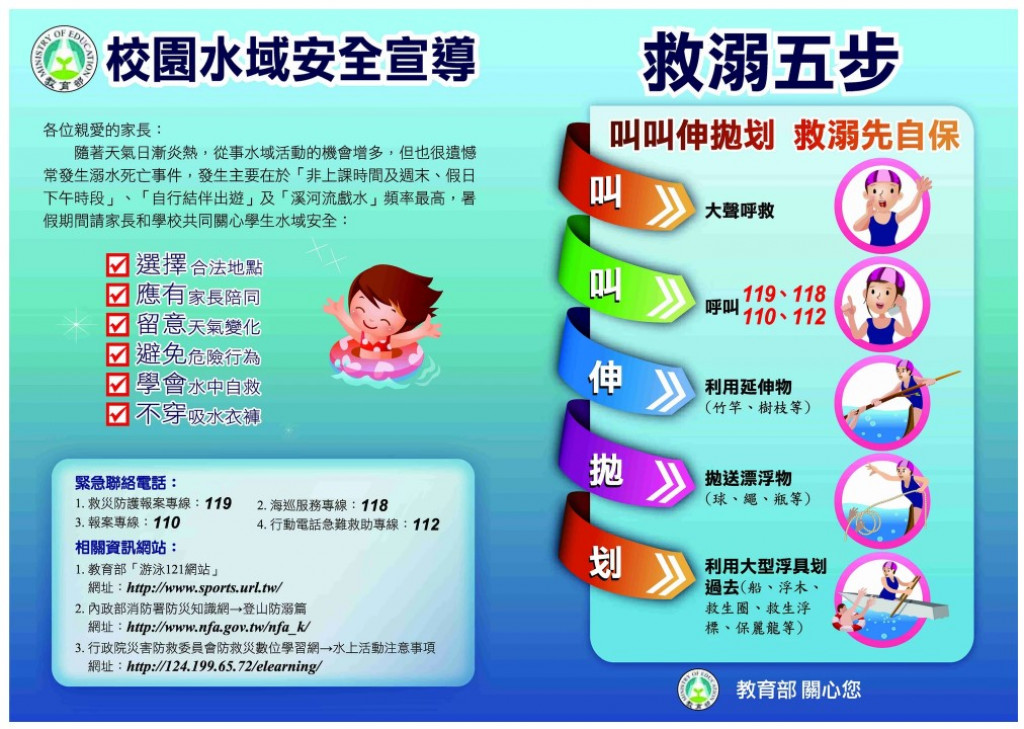 二、 | 請教導學生「水中自救4招」、「救溺五步–叫叫伸拋划」與「防溺十招」等觀念,確實將水域安全資訊傳達予學生,以避免溺水事件發生。 |