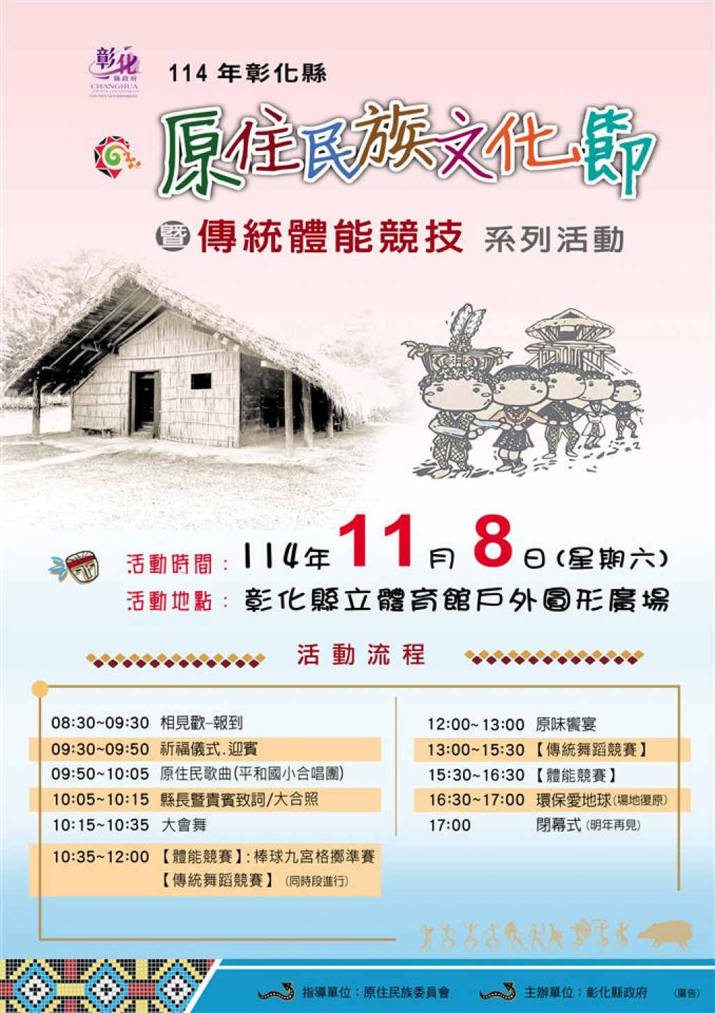 一、 | 本縣一年一度原住民族文化盛事「114年彰化縣原住民族文化節暨傳統體能競技系列活動」,訂於114年11月8日(星期六)在彰化縣立體育館戶外圓形廣場(彰化市健興路1號)舉辦,節目內容多元豐富,詳情請見彰化縣政府民政處網站(https://civil.chcg.gov.tw/03bulletin/bulletin03.aspx)及「彰化縣原住民生活館」臉書粉絲專頁(https://www.facebook.com/p/彰化縣原住民生活館-100064533528742/?locale=zh_TW),請協助宣傳周知。 |