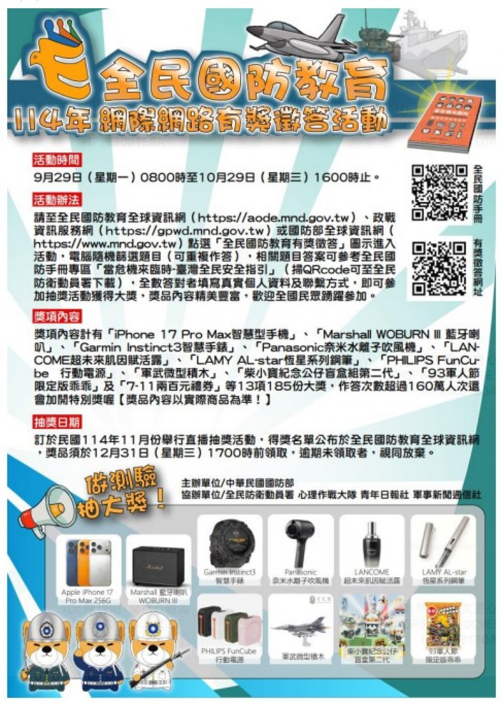 活動期程自9月29日上午8時至10月29日下午4時止,相關資訊已上傳全民國防教育全球資訊網,另檢附海報1張,請貴校鼓勵同仁及學生踴躍參加。
