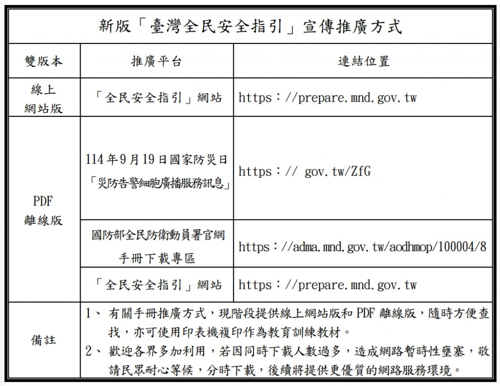 轉知新版臺灣全民安全指引手冊《當危機來臨時:臺灣全民安全指引》,國防部已於114年9月16日公布。